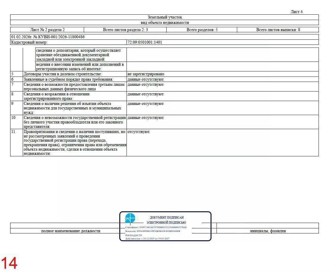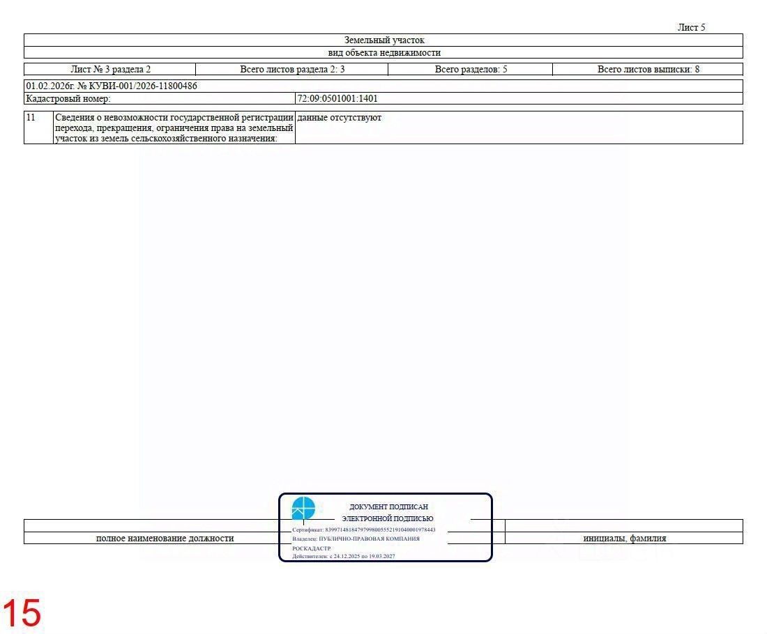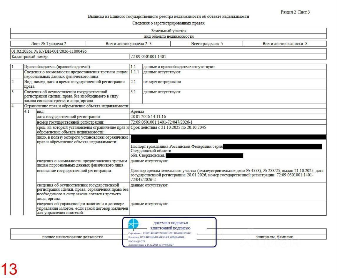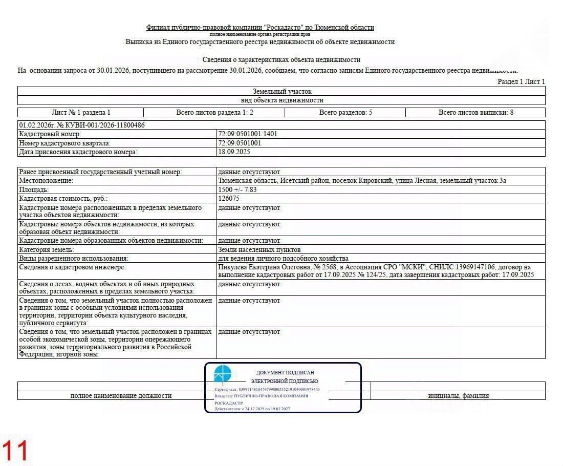 Кадастровый номер 72:09:0501001:1401 — убедитесь в характеристиках самостоятельно на портале Нспд или заказав выписку из росреестра (см. Рис. 11-16).