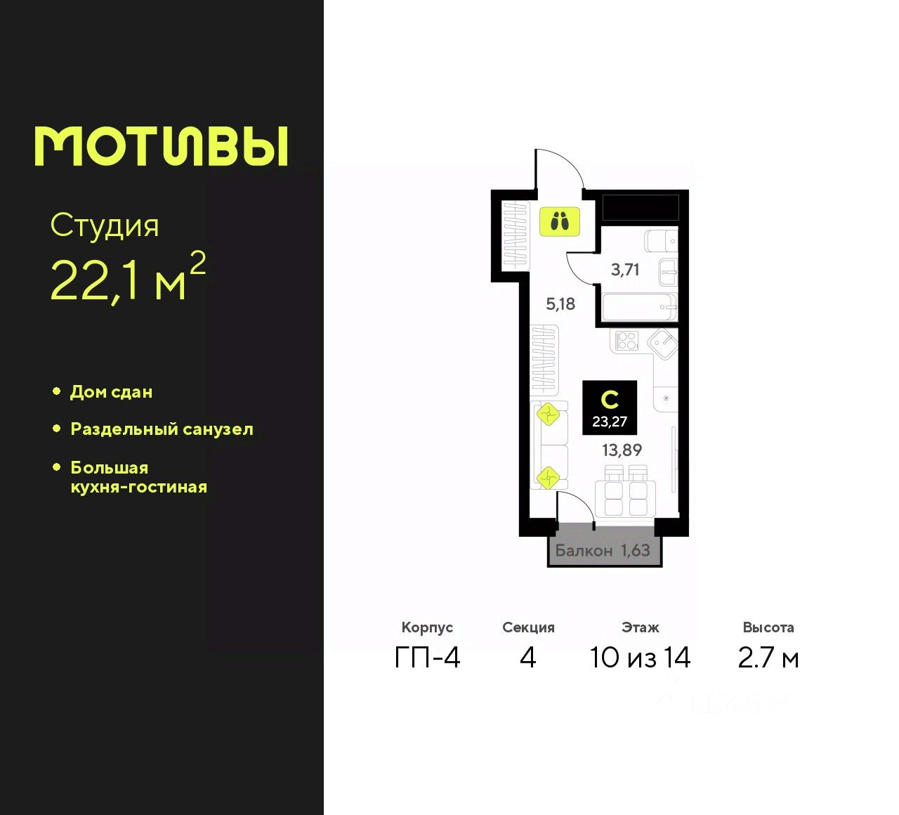 1-комн. квартира-студия от застройщика в ЖК ''Мотивы'' на 10 этаже. Общая площадь: 22.1 кв.м. Высота потолков 2.7 м.