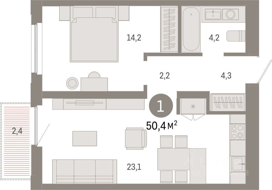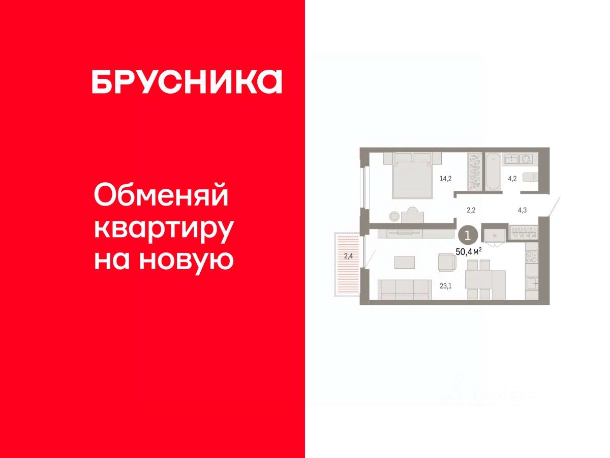 Квартира с кухней-гостиной и одной спальней в жилом районе ''Зарека''. Особенности планировки: балкон, предчистовая отделка. квартиры в нашей базе: ЗРК05.2-Ж1.7.4.