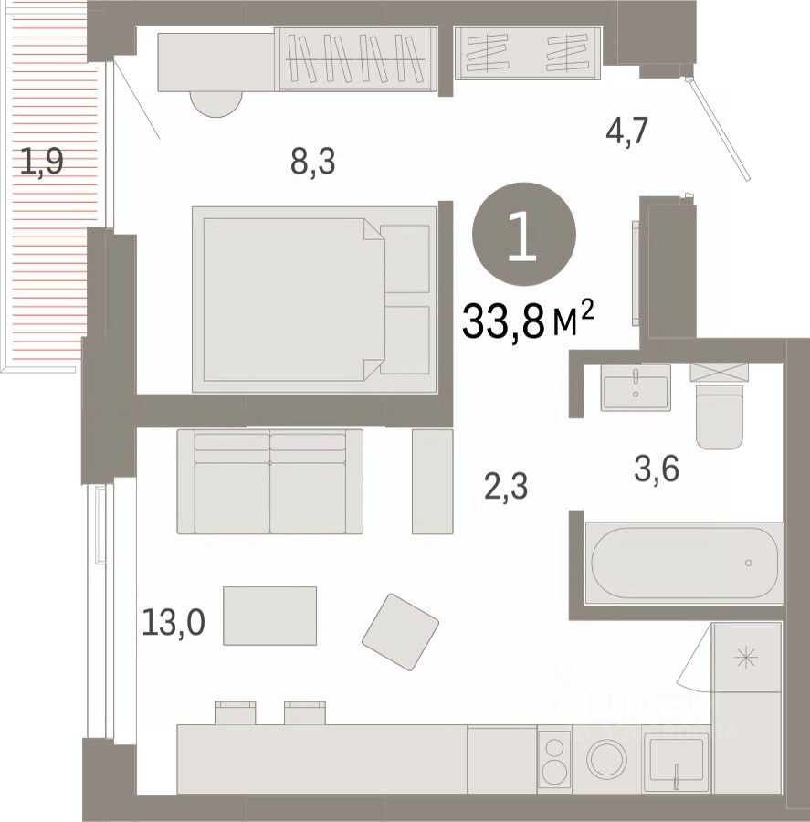 Квартира с кухней-гостиной и одной спальней в жилом районе ''Зарека''. Особенности планировки: балкон, предчистовая отделка. квартиры в нашей базе: ЗРК05.1-Ж1.12.7.