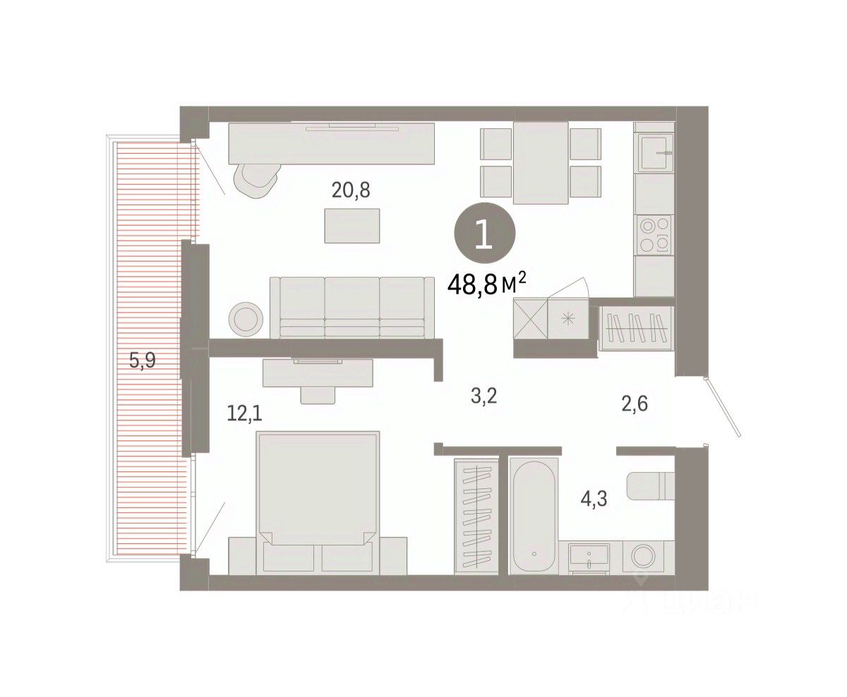 Продается 1-комн. квартира с предчистовой отделкой в ЖК ''Республики 205'' на 6 этаже. Общая площадь: 48.79 кв.м. Высота потолков 2.7 м.
