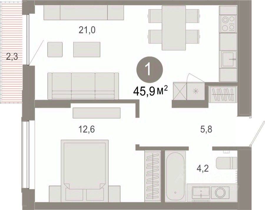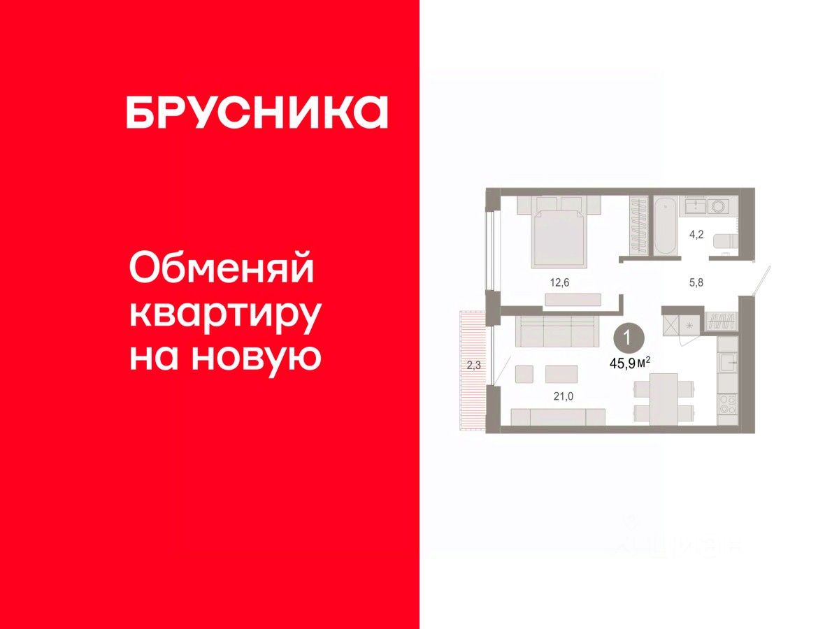 Квартира с кухней-гостиной и одной спальней в Октябрьском на Туре. Особенности планировки: балкон, предчистовая отделка. квартиры в нашей базе: ОКТ09-Ж1.15.4.