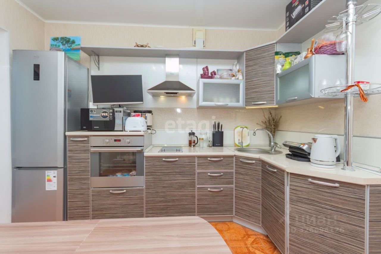 На кухне уложена плитка, предусмотрен электрический подогрев пола, что делает её особенно уютной в холодное время года. Квартира включает две светлые спальни, одна из которых с тремя окнами, что обеспечивает естественное освещение в течение всего дня.