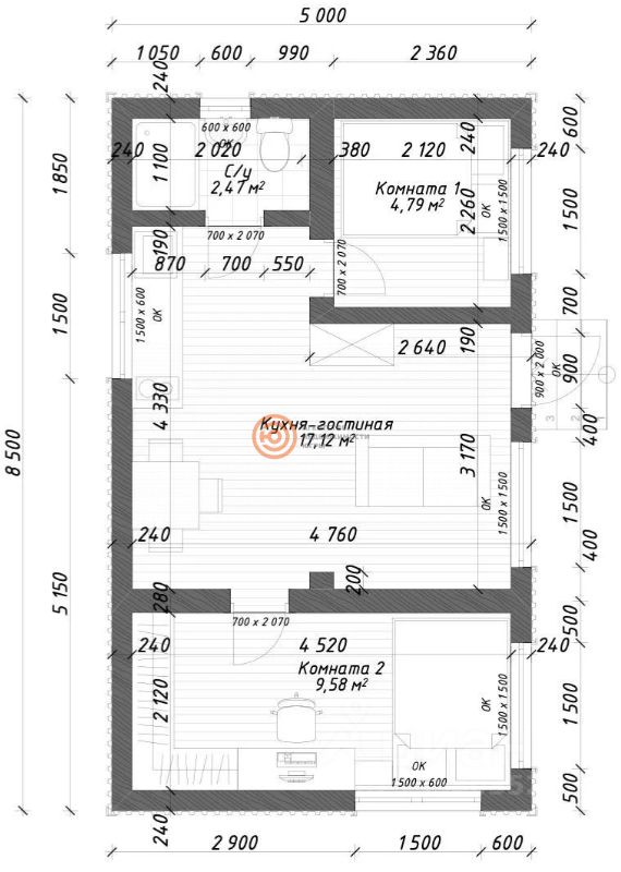 Две изолированные спальные комнаты и большая кухня гостинная.