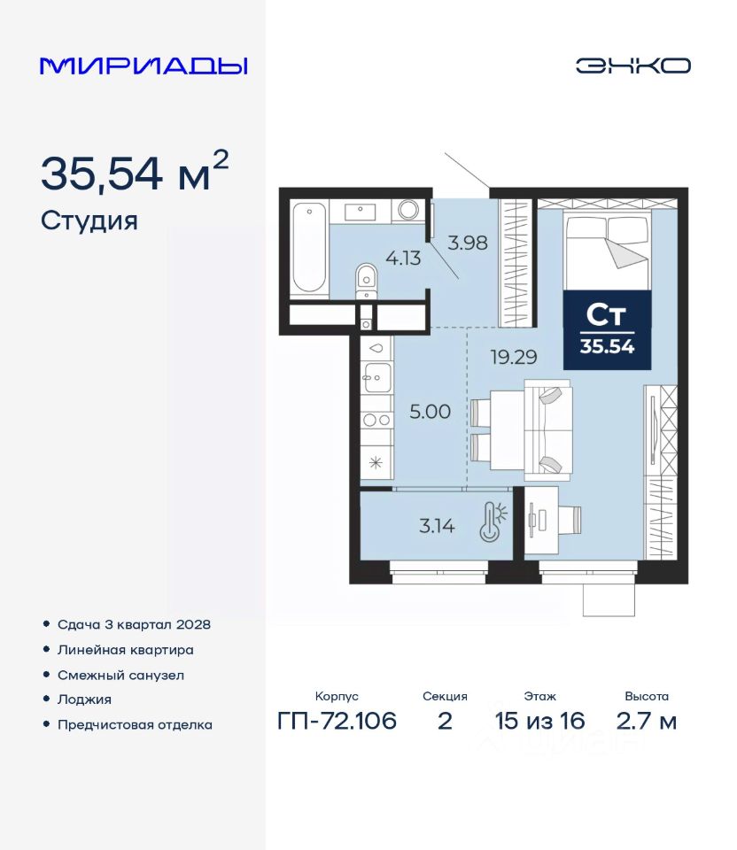 1-комн. квартира-студия с предчистовой отделкой в ЖК ''Мириады'' на 15 этаже. Общая площадь: 35.54 кв.м., площадь гостиной 24.29 кв.м., из которых 5 кв.м. выделено под кухонную зону. Все окна выходят на одну сторону. В квартире одна лоджия, один совмещенный санузел. Высота потолков 2.7 м.