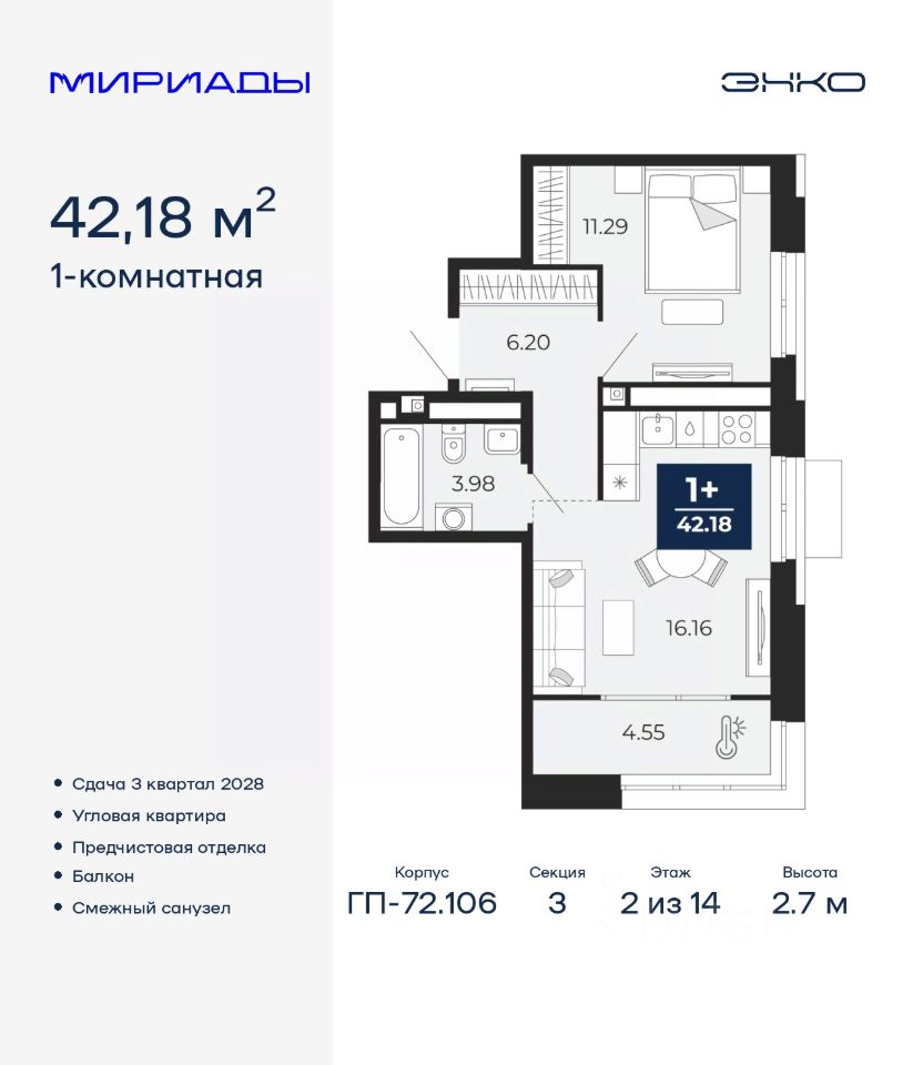 Продается однокомнатная квартира с предчистовой отделкой в ЖК ''Мириады'' на 2 этаже. Общая площадь: 42.18 кв.м., жилая: 11.29 кв.м., площадь просторной кухни-столовой: 16.16 кв.м. Угловая квартира, идеально подойдет любителям тишины и панорамных видов. В квартире один балкон, один совмещенный санузел. Высота потолков 2.7 м.