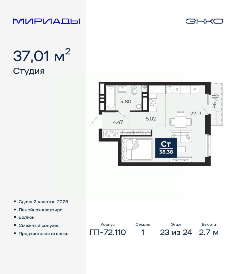 Продается 1-комн. квартира-студия от застройщика с предчистовой отделкой в ЖК ''Мириады'' на 23 этаже. Общая площадь: 37.01 кв.м., площадь гостиной 27.15 кв.м., из которых 5.02 кв.м. выделено под кухонную зону. Все окна выходят на одну сторону. В квартире один балкон, один совмещенный санузел. Высота потолков 2.7 м.