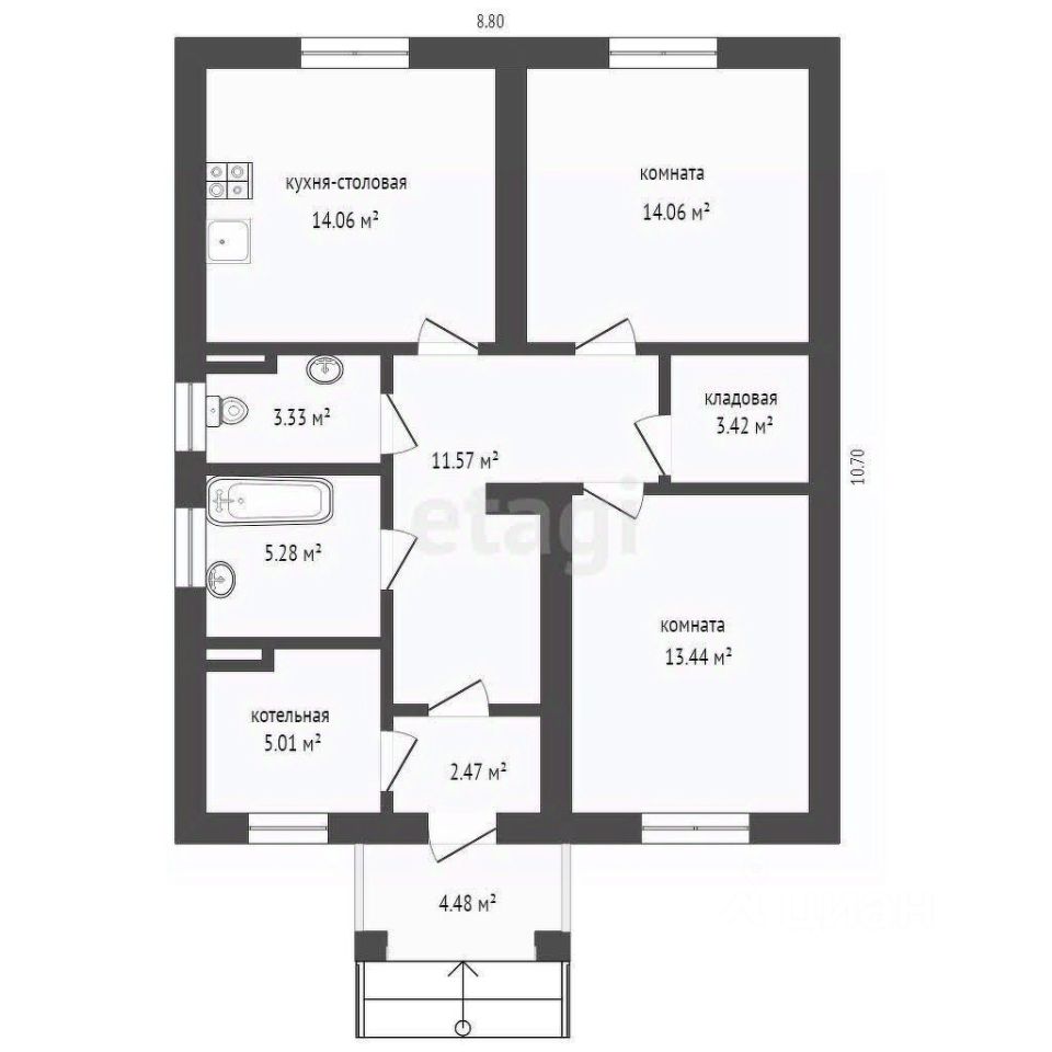 Дом выполнен из качественного бруса, обработанного биозащитой, что обеспечивает долговечность и надежность. Просторная кухня-гостиная станет настоящим центром семейных встреч, а две уютные спальни обеспечат вам спокойный отдых. В доме также предусмотрены котельная и два санузла, что добавляет удобства в повседневной жизни.