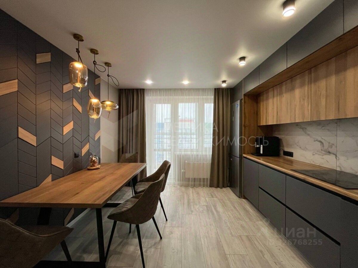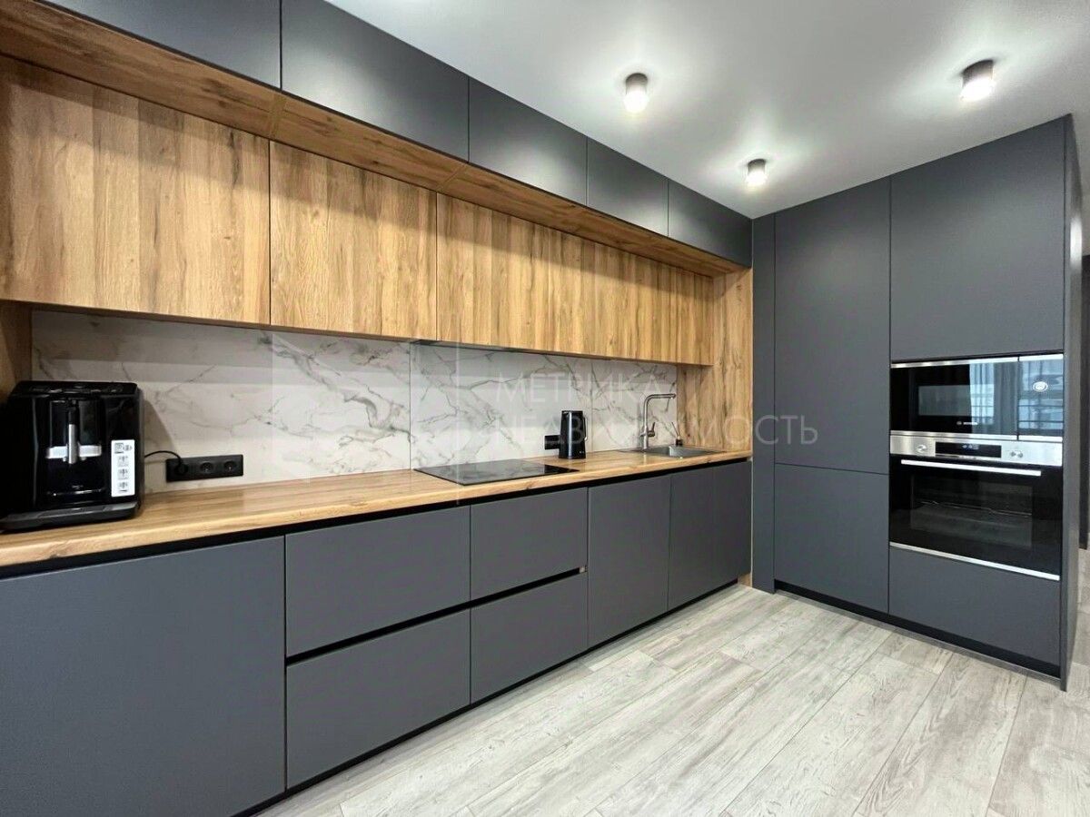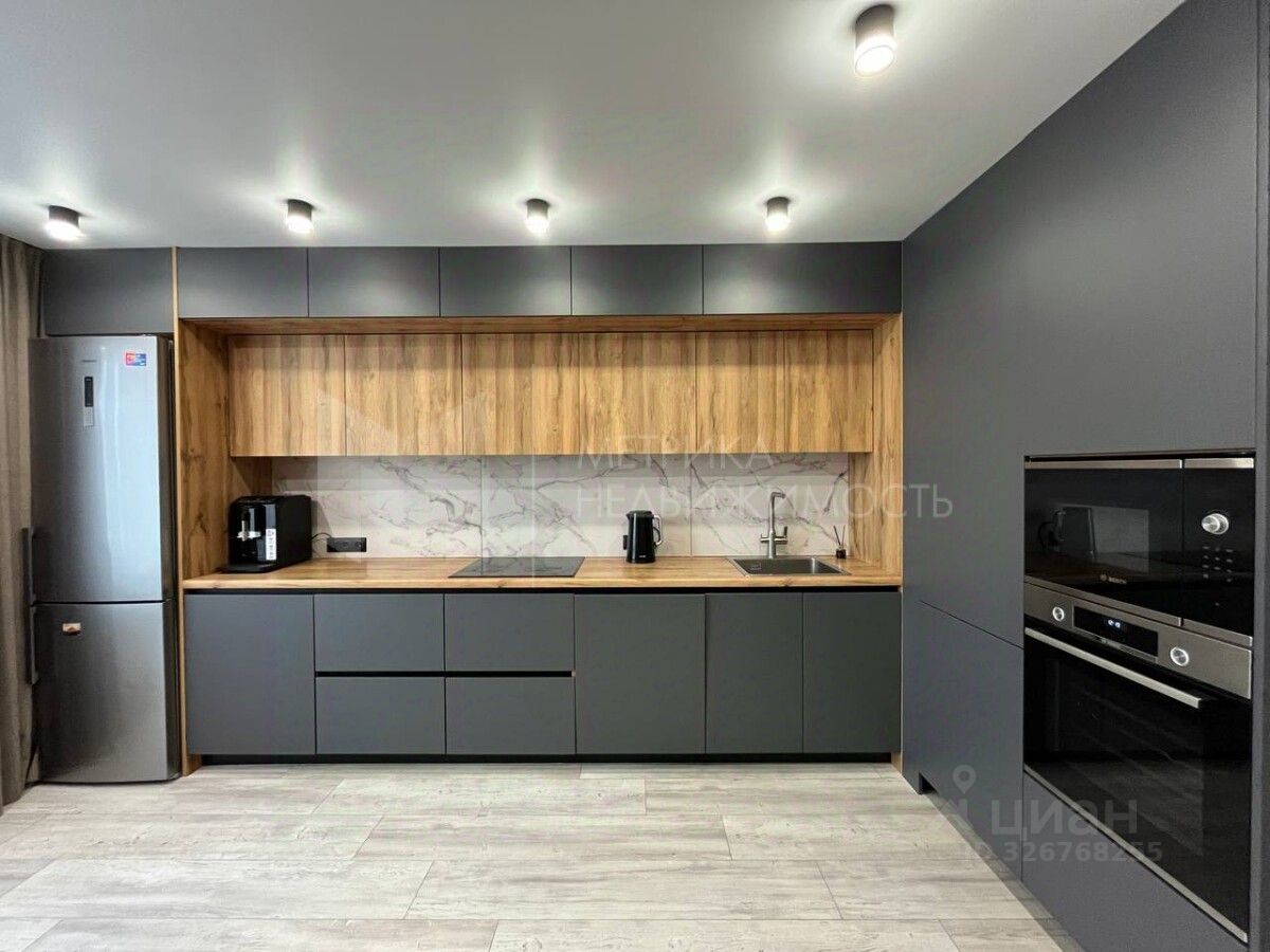 Ремонт выполнен в современном стиле, использовались качественные материалы. Напольное покрытие - ламинат, керамогранит в прихожей. Матовые натяжные потолки с точечными светильниками. Кухонный гарнитур и мебель в отличном состоянии, достаточное количество мест хранения вещей. Установлен теплый пол с цифровым терморегулятором, программируемым по времени и дням недели.