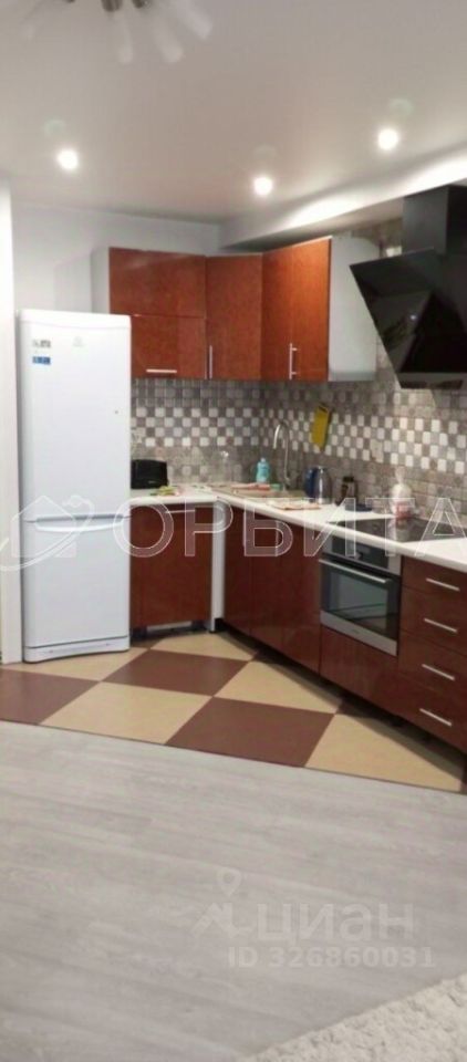 Кухня оборудована стильной мебелью и современной техникой, включая холодильник. Ванная комната выполнена в теплых тонах с отделкой плиткой и оснащена ванной и раковиной.