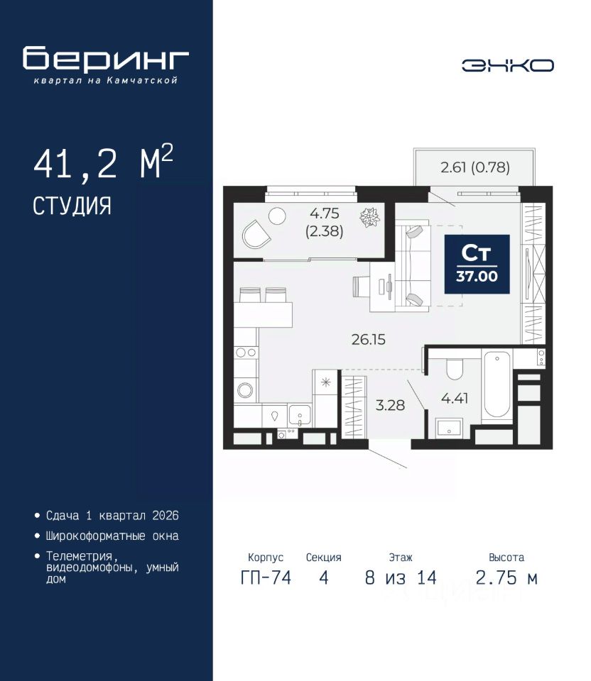 Просторная 1-комн. квартира-студия в ЖК ''Беринг'' на 8 этаже. Общая площадь: 41.2 кв.м. Высота потолков 2.75 м.