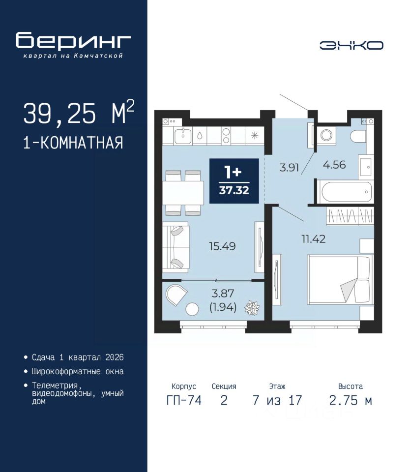 Продается 1-комн. квартира от застройщика в ЖК ''Беринг'' на 7 этаже. Общая площадь: 39.25 кв.м. Высота потолков 2.75 м.