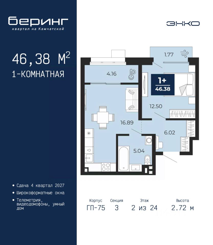 Продается однокомнатная квартира в ЖК ''Беринг'' на 2 этаже. Общая площадь: 46.38 кв.м. Высота потолков 2.72 м.
