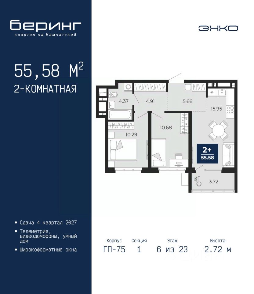 Продается 2-комн. квартира в ЖК ''Беринг'' на 6 этаже. Общая площадь: 55.58 кв.м. Высота потолков 2.72 м.