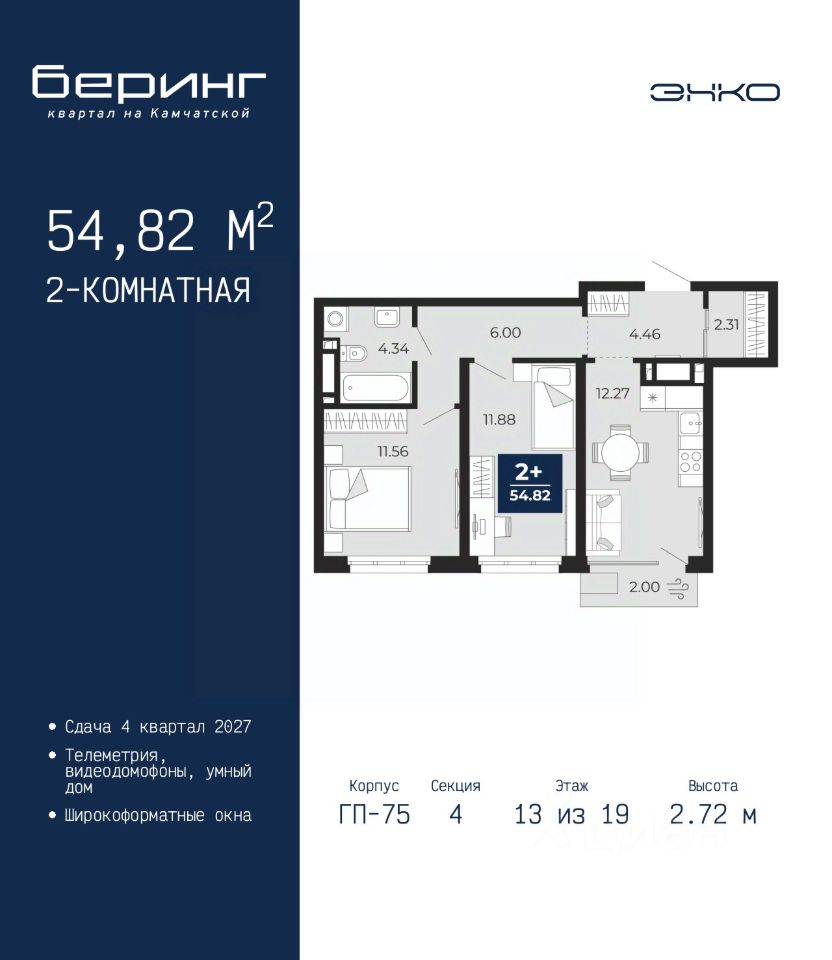 Двухкомнатная квартира в ЖК ''Беринг'' на 13 этаже. Общая площадь: 54.82 кв.м. Высота потолков 2.72 м.