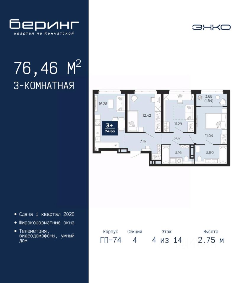 3-комн. квартира в ЖК ''Беринг'' на 4 этаже. Общая площадь: 76.46 кв.м. Высота потолков 2.75 м.