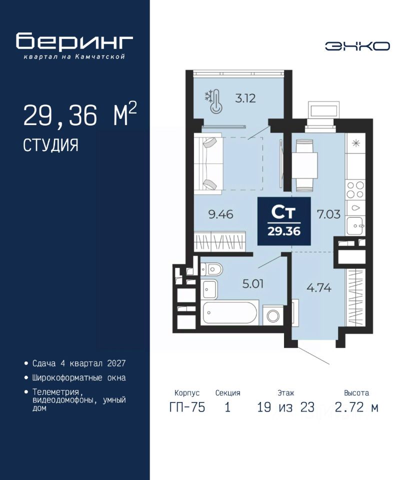 Продается 1-комн. квартира-студия в ЖК ''Беринг'' на 19 этаже. Общая площадь: 29.36 кв.м. Высота потолков 2.72 м.