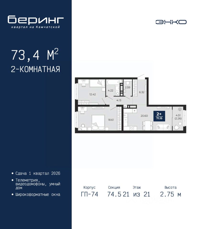 Просторная 2-комн. квартира в ЖК ''Беринг'' на 21 этаже. Общая площадь: 73.4 кв.м. Высота потолков 2.75 м.