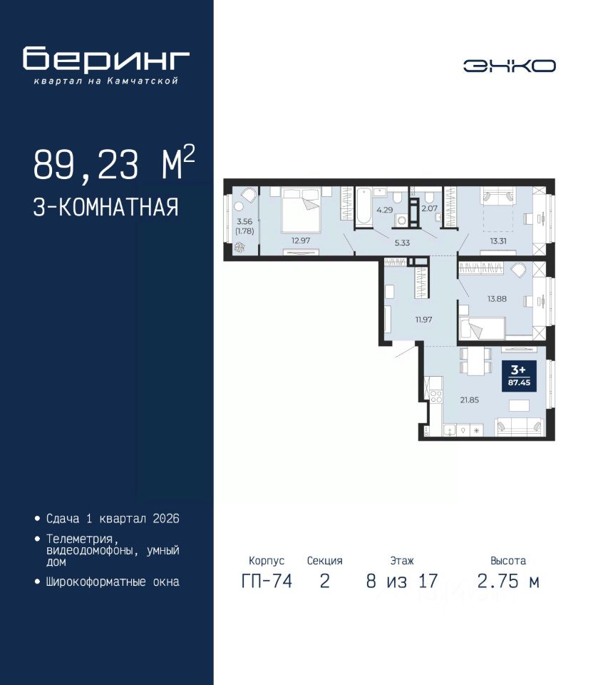 Просторная трехкомнатная квартира в ЖК ''Беринг'' на 8 этаже. Общая площадь: 89.23 кв.м. Высота потолков 2.75 м.