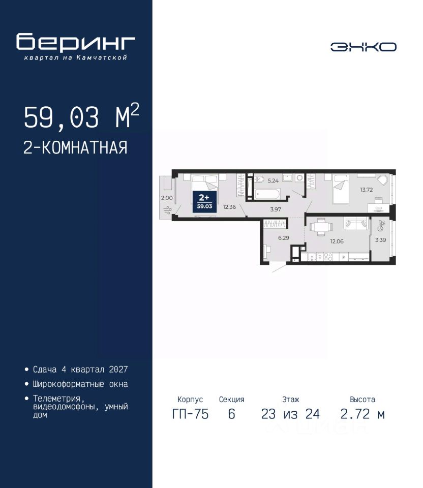 Продается 2-комн. квартира от застройщика в ЖК ''Беринг'' на 23 этаже. Общая площадь: 59.03 кв.м. Высота потолков 2.72 м.