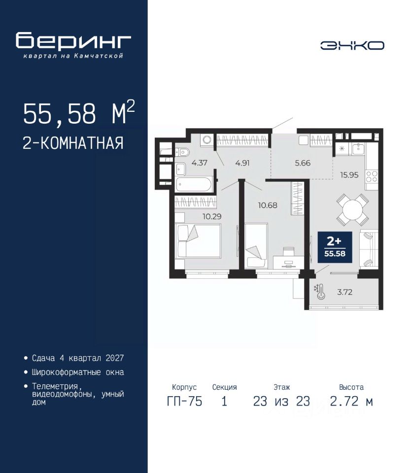 2-комн. квартира от застройщика в ЖК ''Беринг'' на 23 этаже. Общая площадь: 55.58 кв.м. Высота потолков 2.72 м.