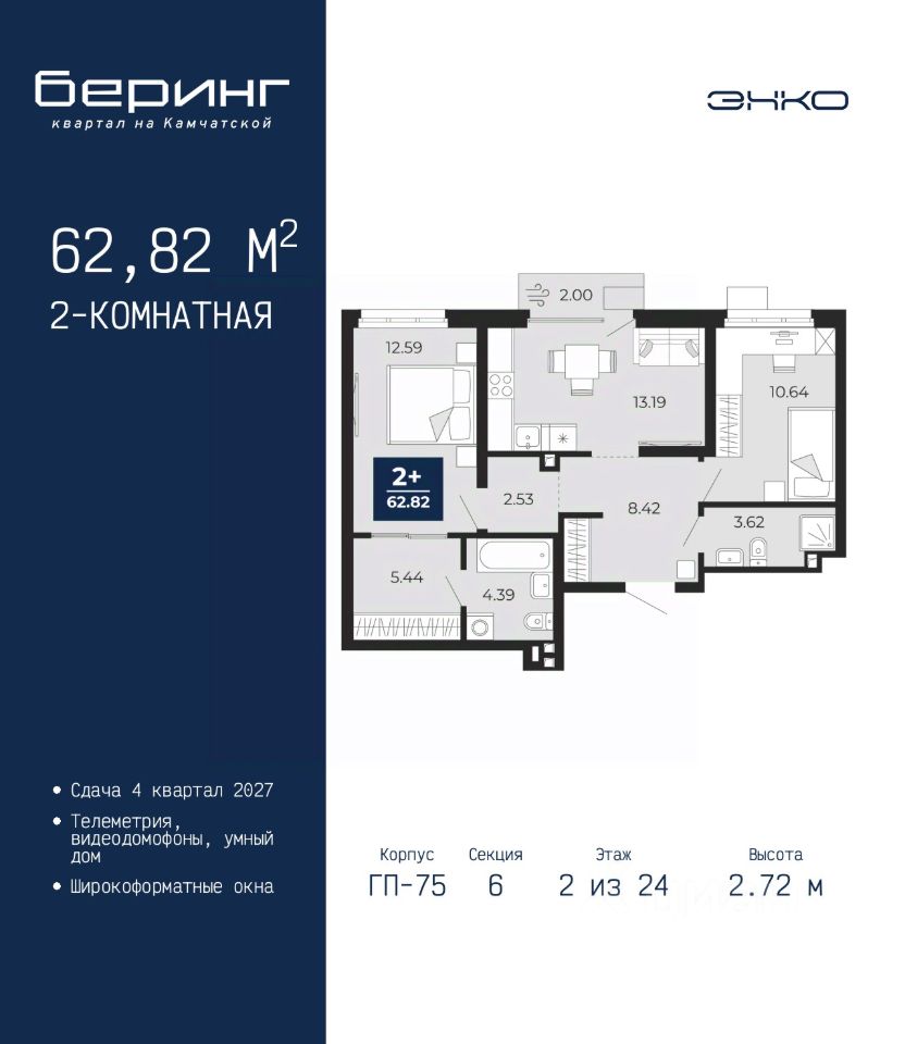 Двухкомнатная квартира в ЖК ''Беринг'' на 2 этаже. Общая площадь: 62.82 кв.м. Высота потолков 2.72 м.