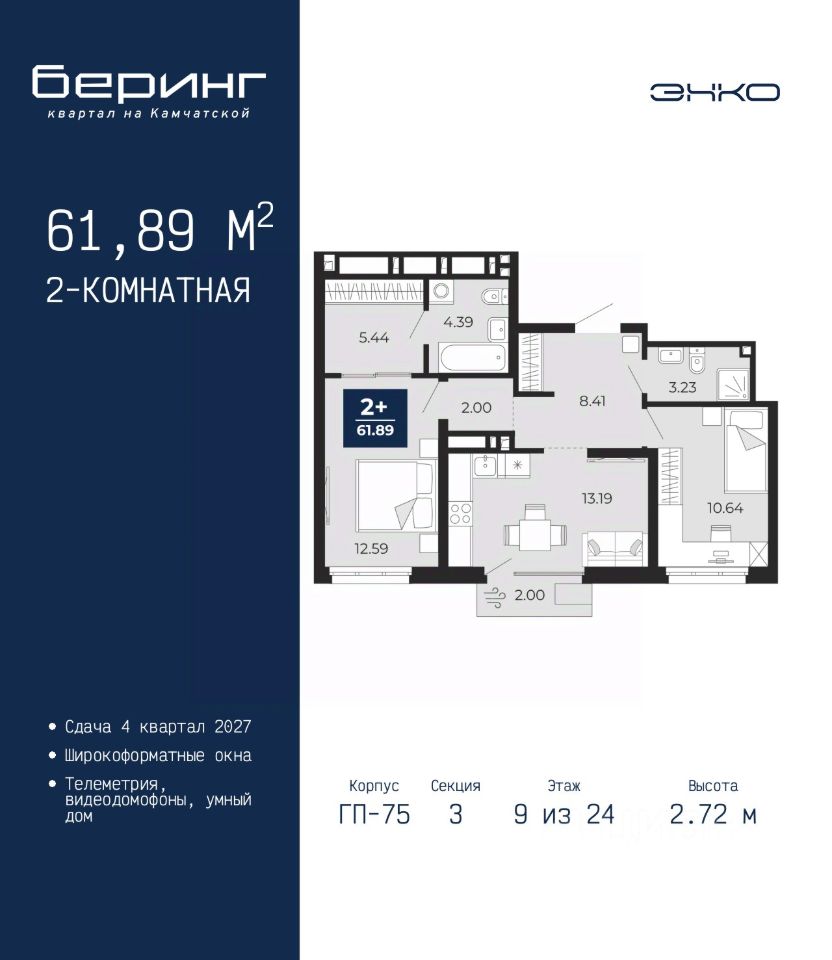 2-комн. квартира от застройщика в ЖК ''Беринг'' на 9 этаже. Общая площадь: 61.89 кв.м. Высота потолков 2.72 м.