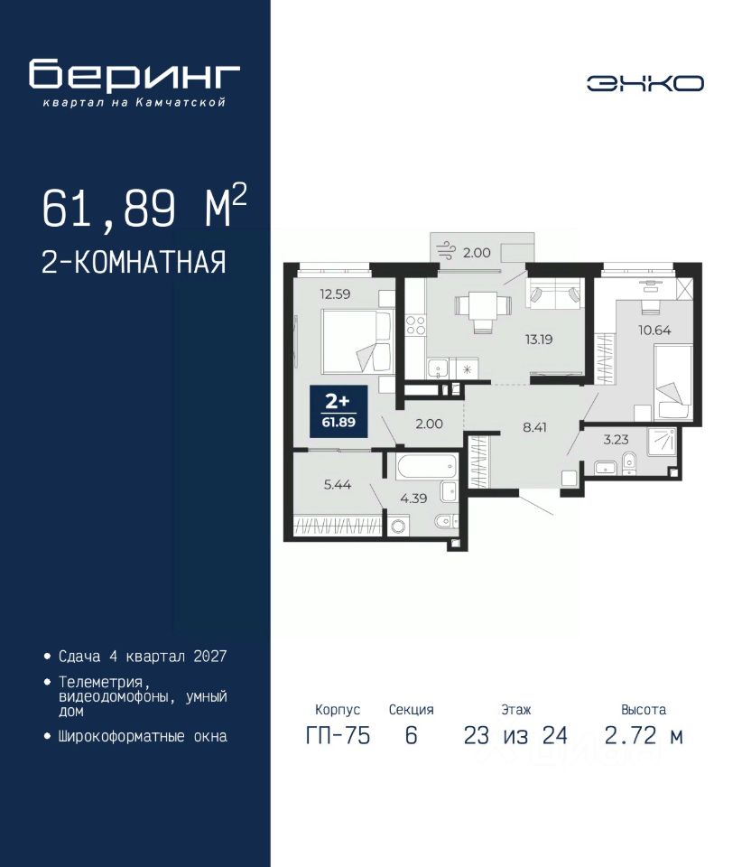 Просторная 2-комн. квартира в ЖК ''Беринг'' на 23 этаже. Общая площадь: 61.89 кв.м. Высота потолков 2.72 м.