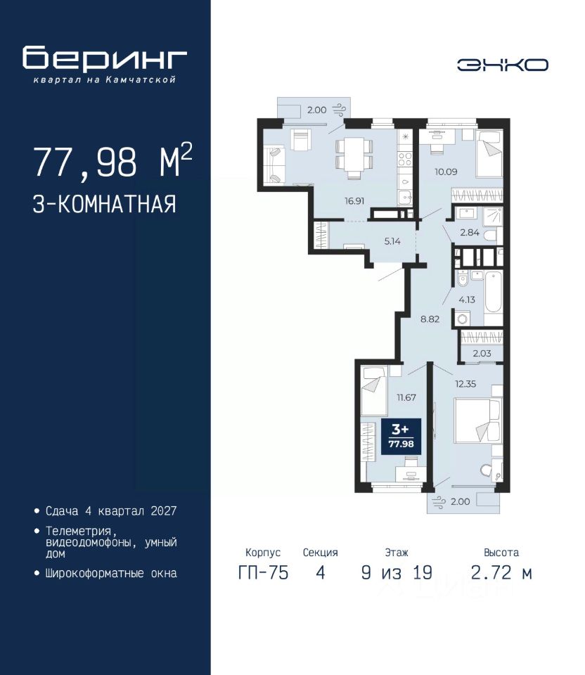 3-комн. квартира в ЖК ''Беринг'' на 9 этаже. Общая площадь: 77.98 кв.м. Высота потолков 2.72 м.