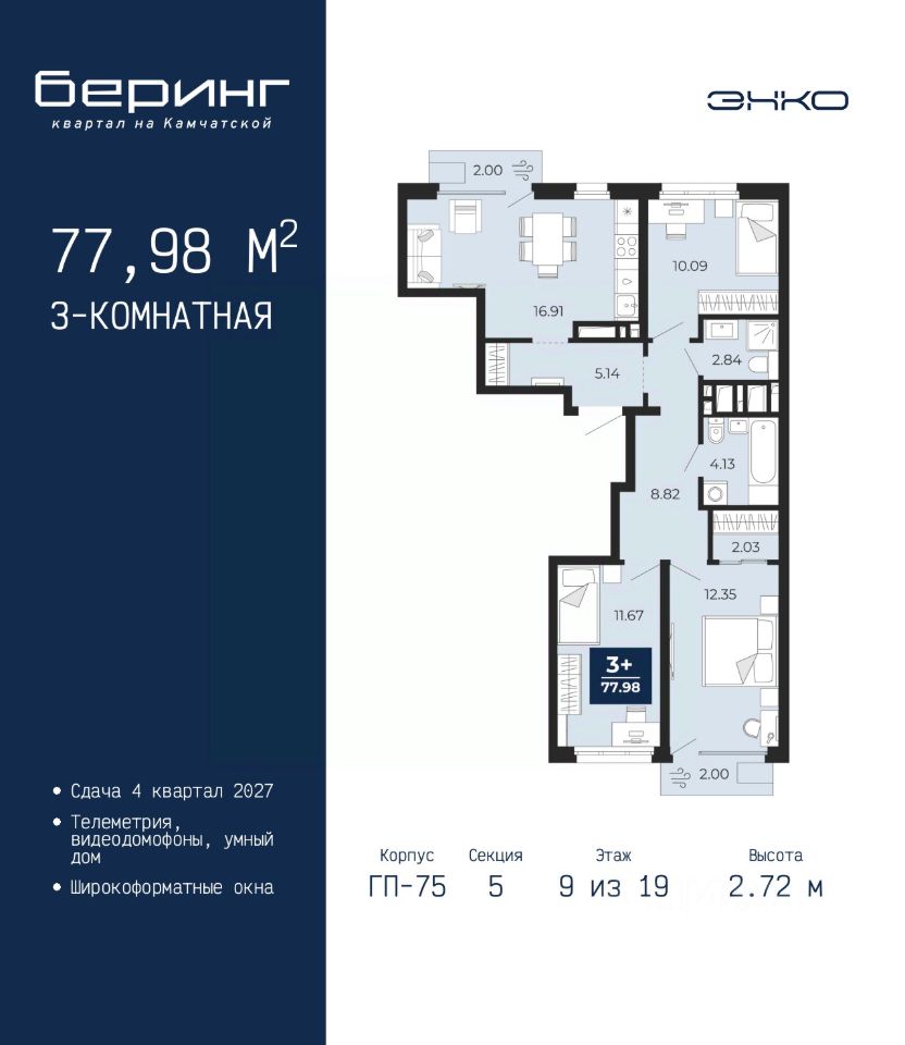 3-комн. квартира от застройщика в ЖК ''Беринг'' на 9 этаже. Общая площадь: 77.98 кв.м. Высота потолков 2.72 м.