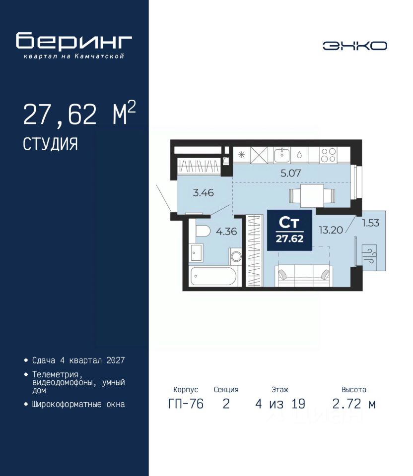 Просторная 1-комн. квартира-студия в ЖК ''Беринг'' на 4 этаже. Общая площадь: 27.62 кв.м. Высота потолков 2.72 м.