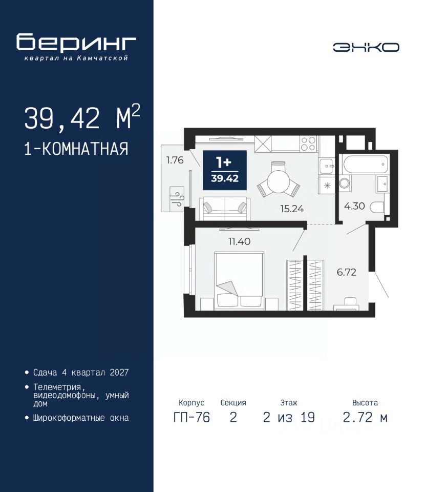 1-комн. квартира в ЖК ''Беринг'' на 2 этаже. Общая площадь: 39.42 кв.м. Высота потолков 2.72 м.