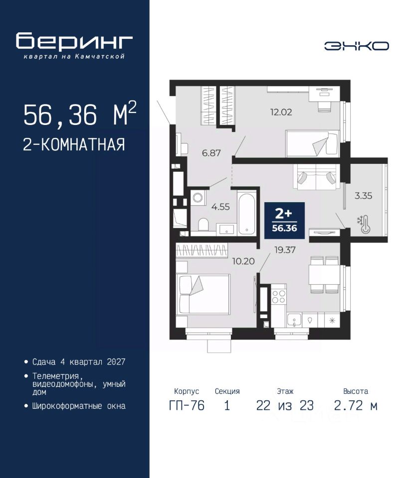 2-комн. квартира в ЖК ''Беринг'' на 22 этаже. Общая площадь: 56.36 кв.м. Высота потолков 2.72 м.