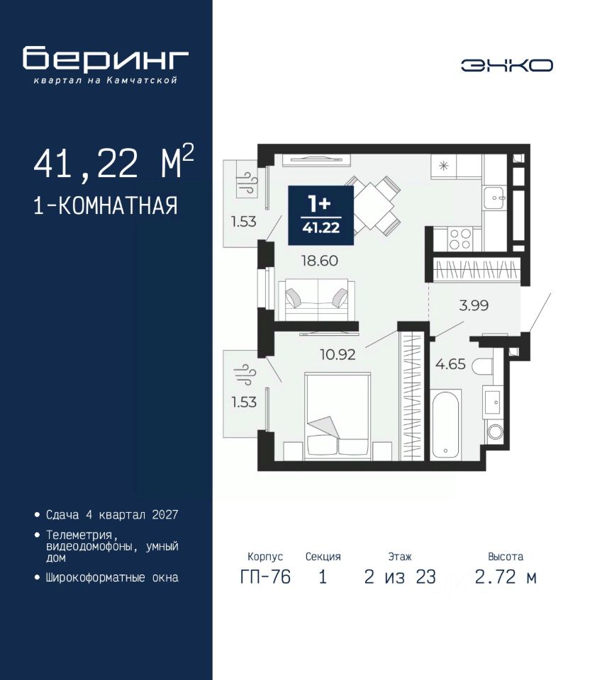 1-комн. квартира в ЖК ''Беринг'' на 2 этаже. Общая площадь: 41.22 кв.м. Высота потолков 2.72 м.
