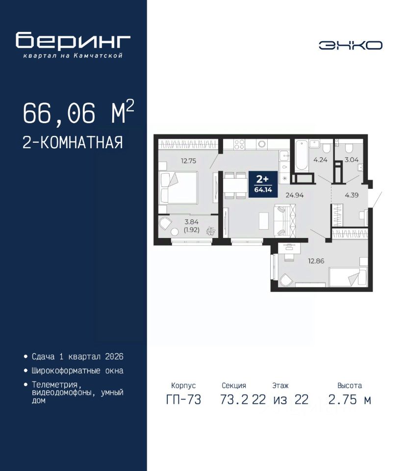 Продается двухкомнатная квартира в ЖК ''Беринг'' на 22 этаже. Общая площадь: 66.06 кв.м. Высота потолков 2.75 м.