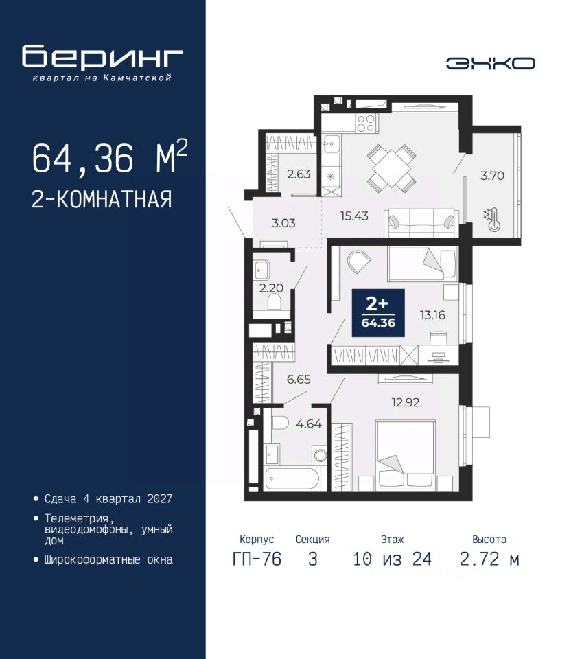 2-комн. квартира от застройщика в ЖК ''Беринг'' на 10 этаже. Общая площадь: 64.36 кв.м. Высота потолков 2.72 м.