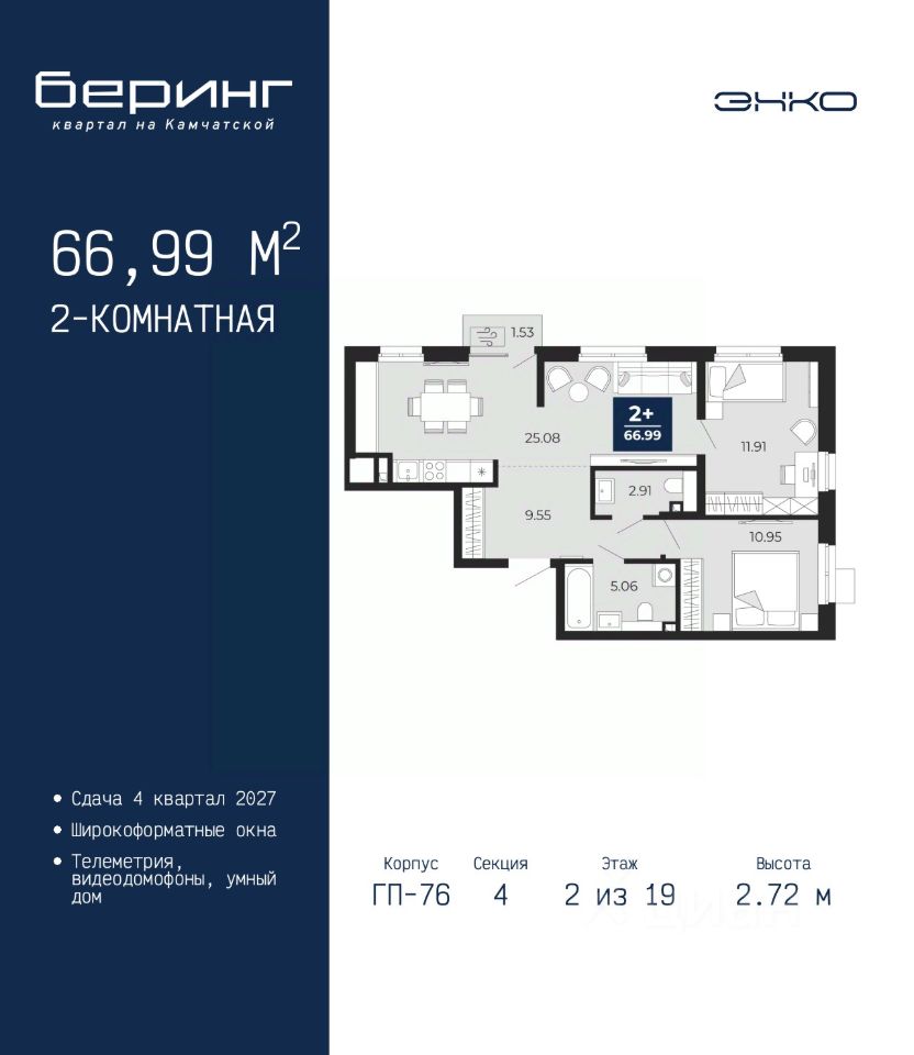 Просторная 2-комн. квартира в ЖК ''Беринг'' на 2 этаже. Общая площадь: 66.99 кв.м. Высота потолков 2.72 м.