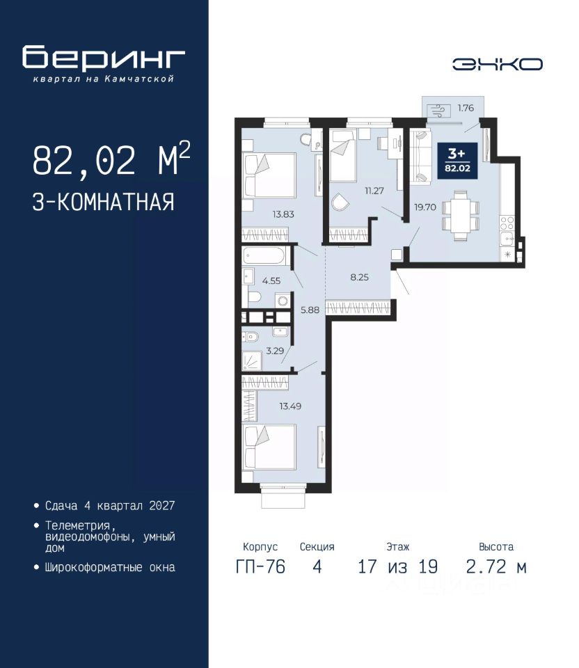 3-комн. квартира от застройщика в ЖК ''Беринг'' на 17 этаже. Общая площадь: 82.02 кв.м. Высота потолков 2.72 м.