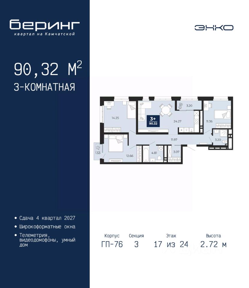Продается трехкомнатная квартира в ЖК ''Беринг'' на 17 этаже. Общая площадь: 90.32 кв.м. Высота потолков 2.72 м.