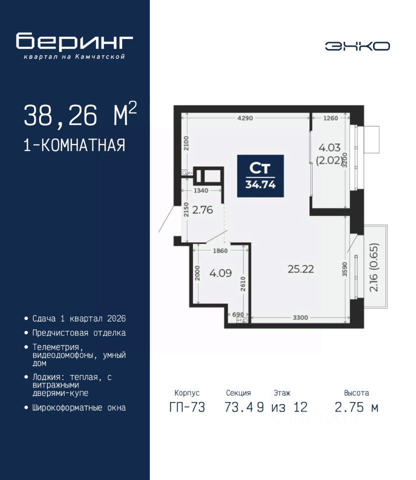 Однокомнатная квартира с предчистовой отделкой в ЖК ''Беринг'' на 9 этаже. Общая площадь: 38.26 кв.м., жилая: 12.95 кв.м., площадь просторной кухни-столовой: 15.48 кв.м. Все окна выходят на одну сторону. В квартире одна лоджия, один совмещенный санузел. Высота потолков 2.75 м.