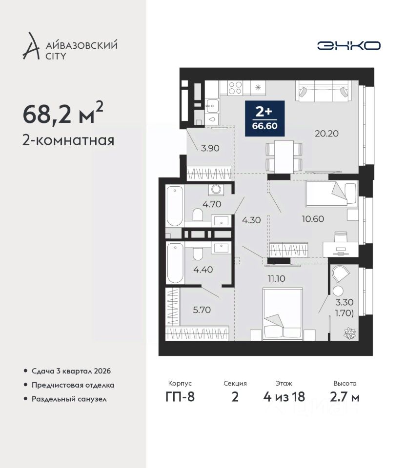 Двухкомнатная квартира с предчистовой отделкой в ЖК ''Айвазовский City'' на 4 этаже. Общая площадь: 68.2 кв.м. Высота потолков 2.7 м.