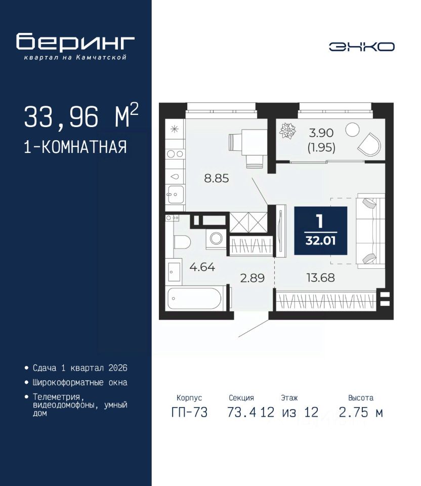 1-комн. квартира в ЖК ''Беринг'' на 12 этаже. Общая площадь: 33.96 кв.м. Высота потолков 2.75 м.