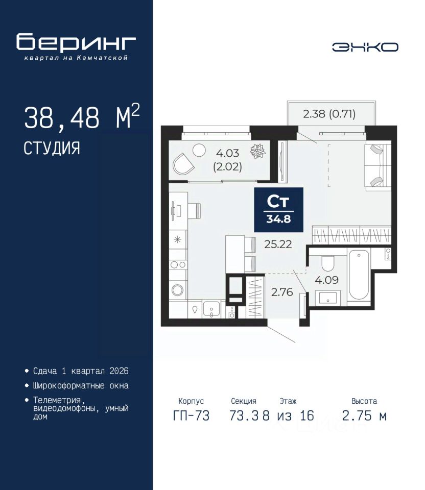 Однокомнатная квартира-студия в ЖК ''Беринг'' на 8 этаже. Общая площадь: 38.48 кв.м. Высота потолков 2.75 м.
