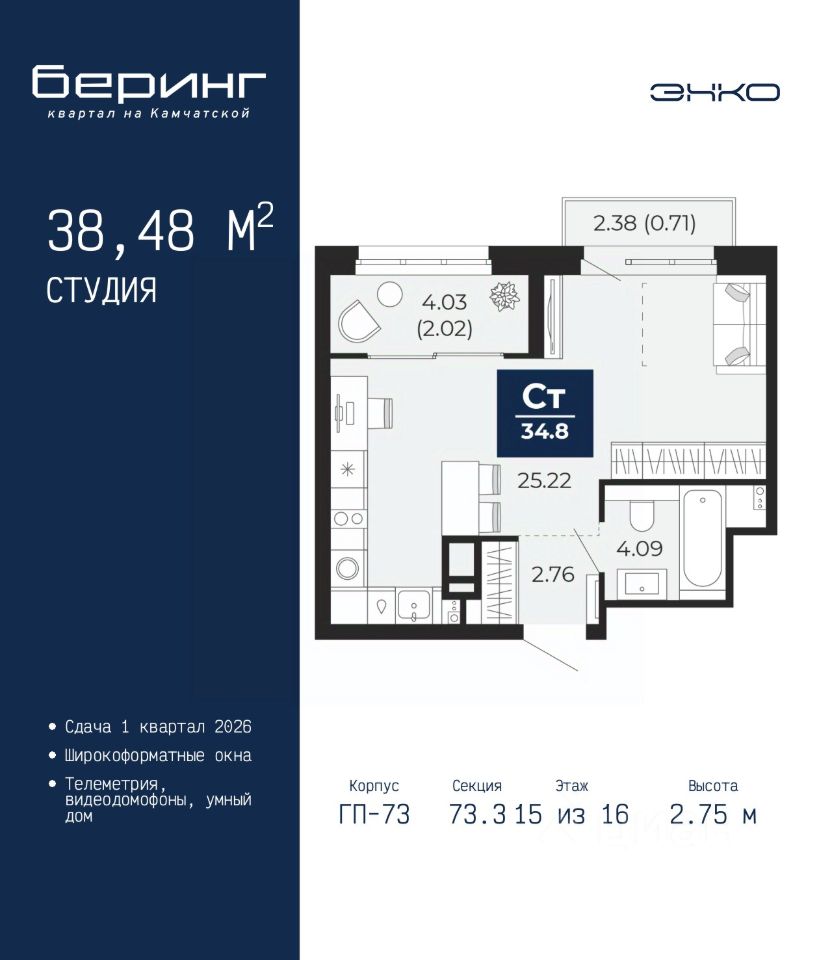 Продается однокомнатная квартира-студия в ЖК ''Беринг'' на 15 этаже. Общая площадь: 38.48 кв.м. Высота потолков 2.75 м.
