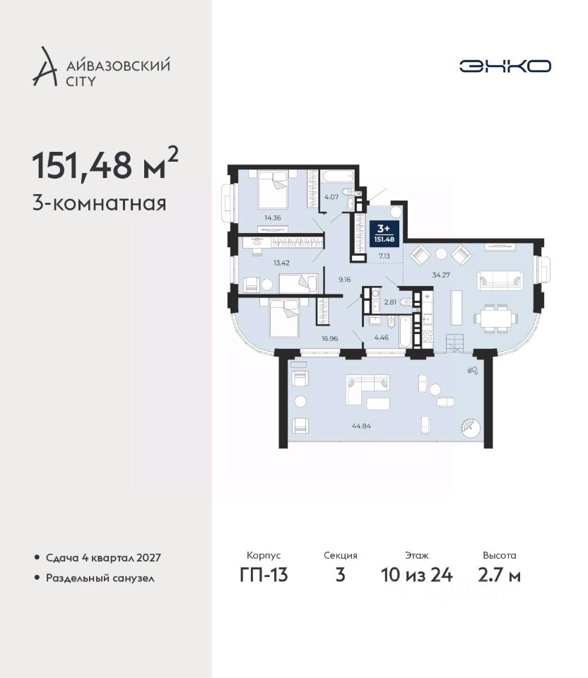 Трехкомнатная квартира от застройщика в ЖК ''Айвазовский City'' на 10 этаже. Общая площадь: 151.48 кв.м. Высота потолков 2.7 м.