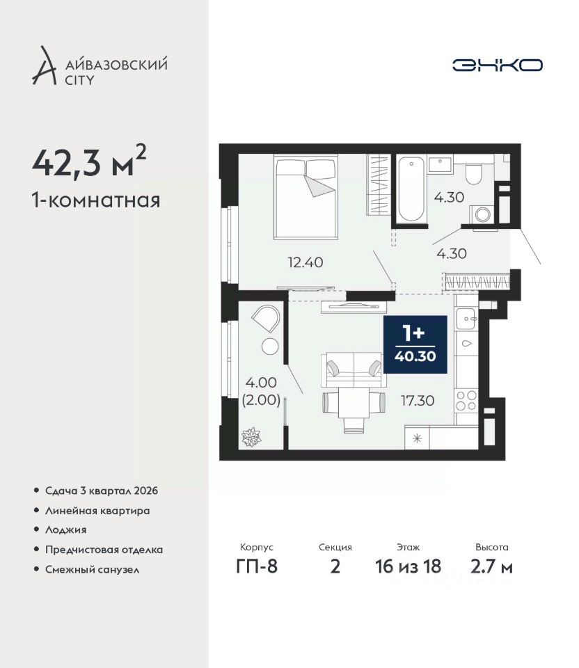 Просторная однокомнатная квартира с предчистовой отделкой в ЖК ''Айвазовский City'' на 16 этаже. Общая площадь: 42.3 кв.м., жилая: 13.4 кв.м., площадь просторной кухни-столовой: 17.1 кв.м. Все окна выходят на одну сторону. В квартире одна лоджия, один совмещенный санузел. Высота потолков 2.7 м.
