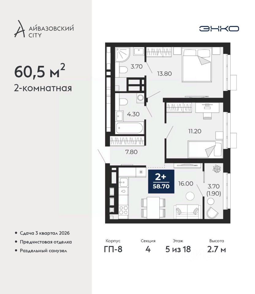 Продается двухкомнатная квартира от застройщика с предчистовой отделкой в ЖК ''Айвазовский City'' на 5 этаже. Общая площадь: 60.5 кв.м. Высота потолков 2.7 м.