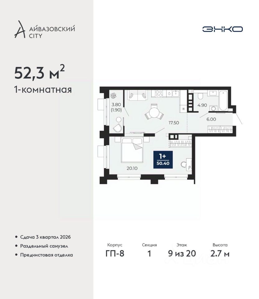 1-комн. квартира от застройщика с предчистовой отделкой в ЖК ''Айвазовский City'' на 9 этаже. Общая площадь: 52.3 кв.м. Высота потолков 2.7 м.