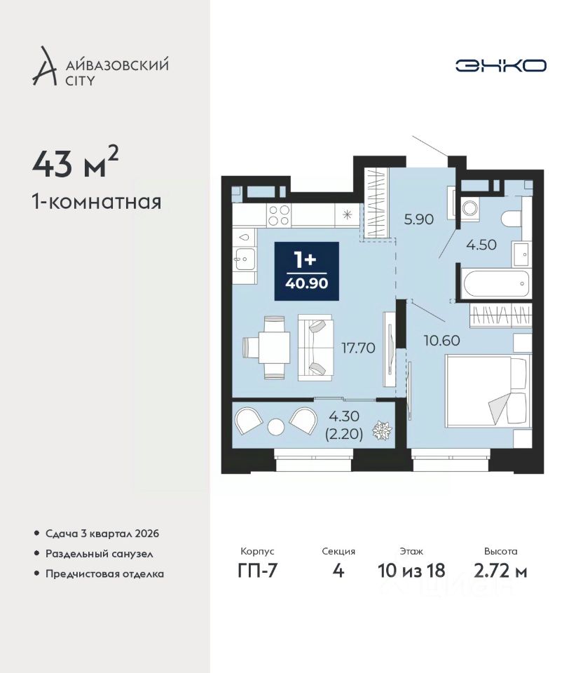 Продается 1-комн. квартира с предчистовой отделкой в ЖК ''Айвазовский City'' на 10 этаже. Общая площадь: 43 кв.м. Высота потолков 2.72 м.