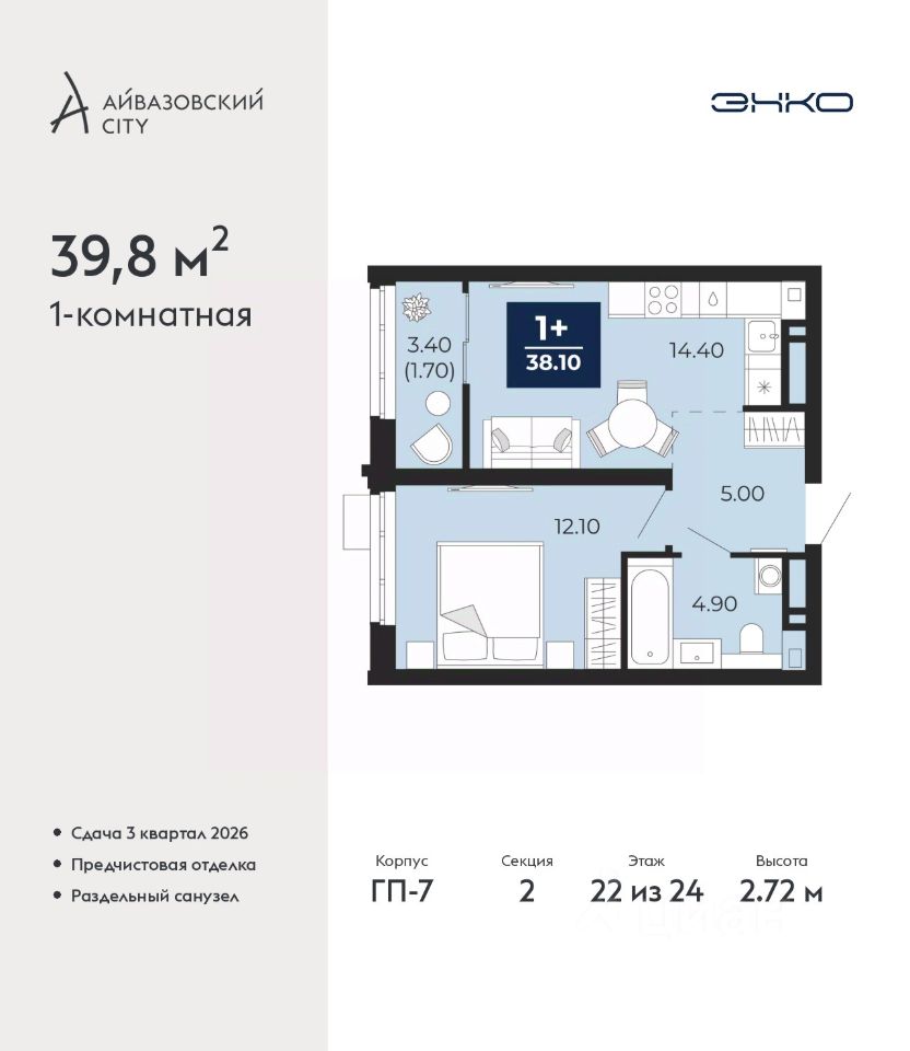 Просторная 1-комн. квартира с предчистовой отделкой в ЖК ''Айвазовский City'' на 22 этаже. Общая площадь: 39.8 кв.м. Высота потолков 2.72 м.